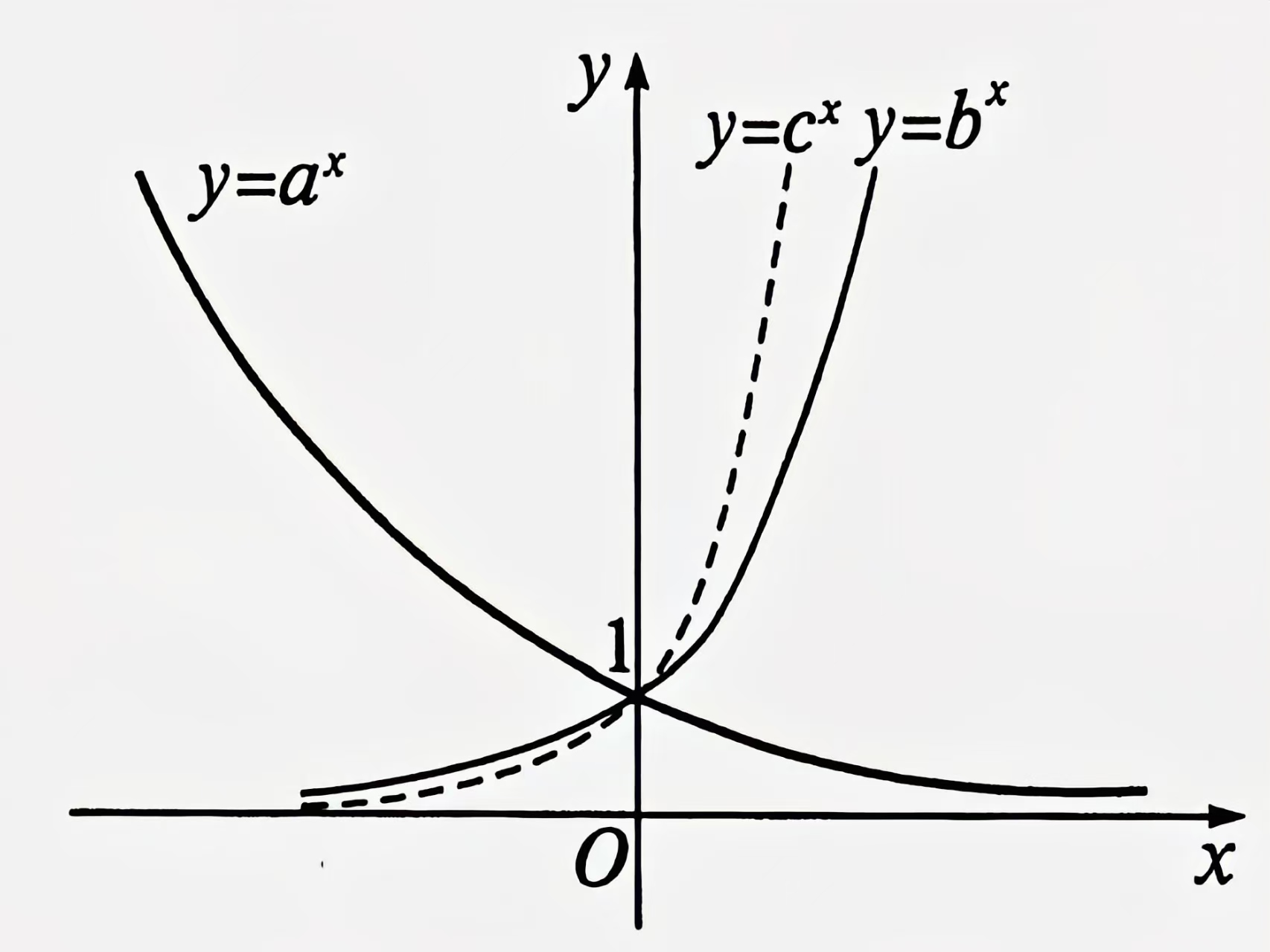 已知三个指数函数 \(y = a^x\), \(y = b^x\), \(y = c^x\) 的图象如下图所示,比较底数 \(a\), \(b\), \(c\) 的大小: